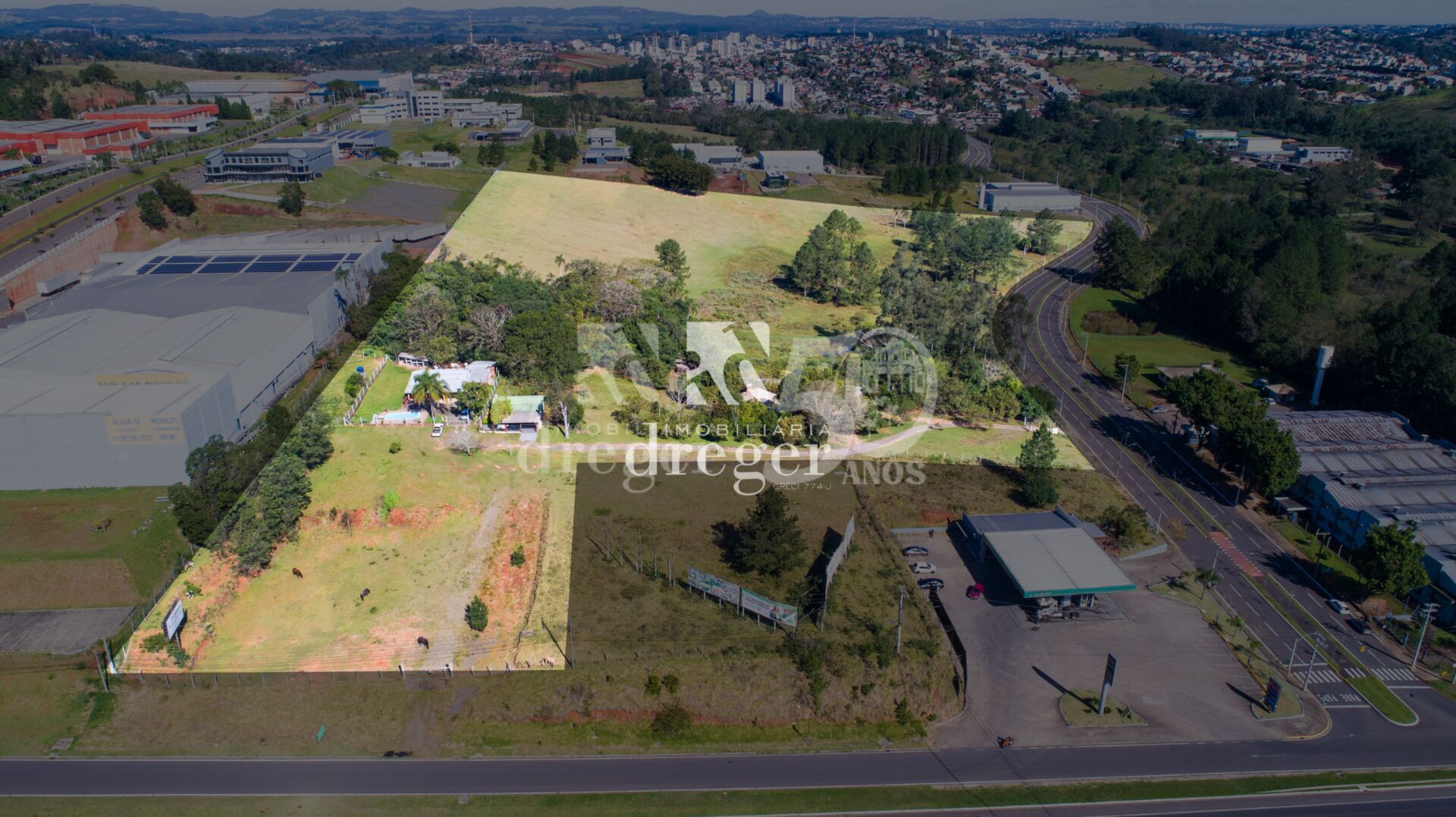 Área de terras, situada na Zona Industrial Norte de Campo Bom, com a área total de 67.927,00m2, com 54,53m de frente para a RS 239 e 335,24m de frente para a Avenida João Pedro Dias. Sobre a área encontra-se construída duas residências de alvenaria e galpão.